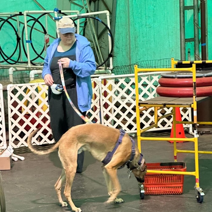 Neither age nor physical abilities come into play for this sport (in either the dog or the handler). Searches are conducted indoors and outdoors in up to 1000 square foot areas. You can choose flat terrain so people and dogs with structural challenges do not need to worry about footing. If your dog has a nose, he can succeed at this sport every time he plays!